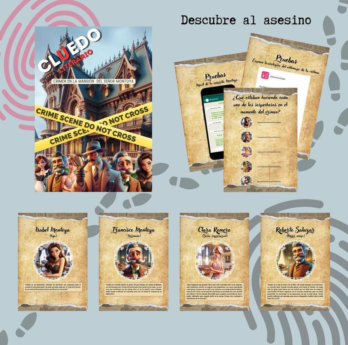 Cluedo literario sobre un nuevo crimen, esta vez en la mansión del señor Montoya, donde los alumnos deberán de leer atentamente las coartadas de los sospechosos y estudiar las pistas del caso para resolver el misterio. A través de este recurso los alumnos podran trabajar la comprensión lectora de una manera lúdica y atractiva. Adaptado de manera inclusiva para NEAE.